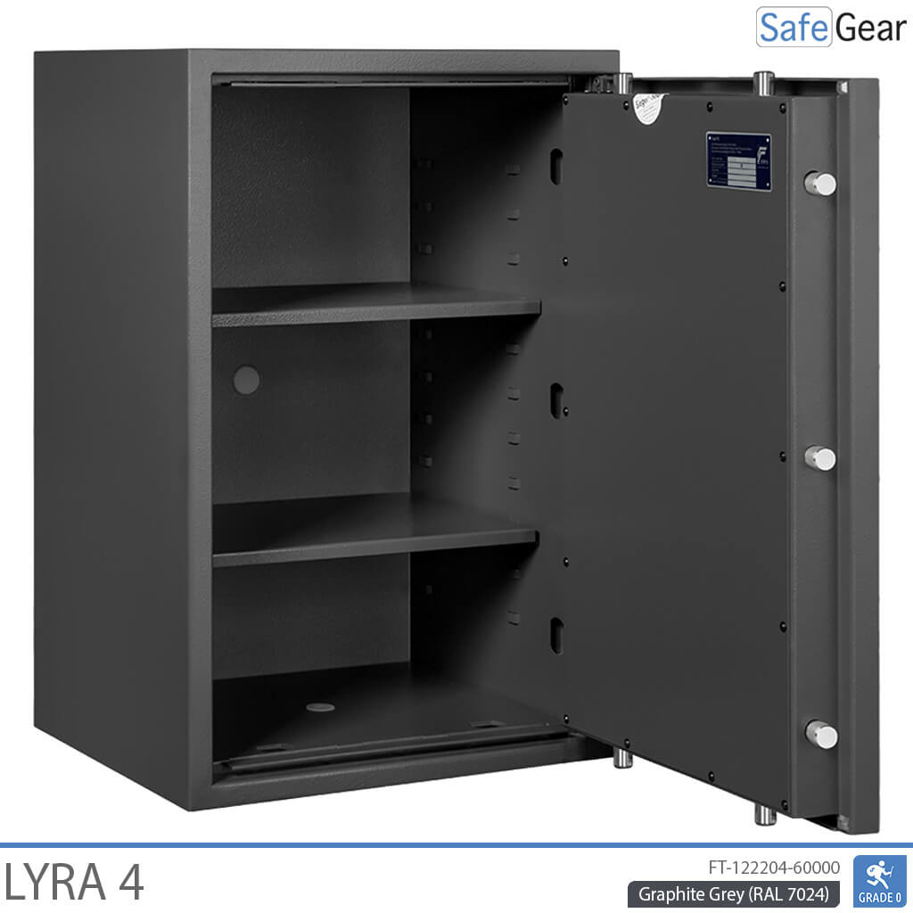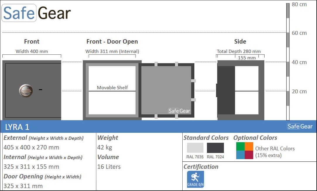 La serie Lyra ha sido probada y homologada en Alemania como una caja fuerte de Grado 0, para protección contra robo, según los Estándares Europeos EN 1143-1 por VdS.