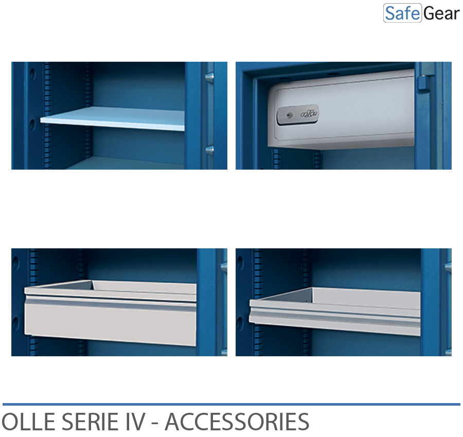La serie Ollé IV, adicionalmente dispone de estanterías básicas regulables en altura y cajones extensibles de 50 mm o 100 mm de altura en los que colocar objetos y se puedan sujetar. Este tipo de cajones no están disponibles para el modelo AP-2.